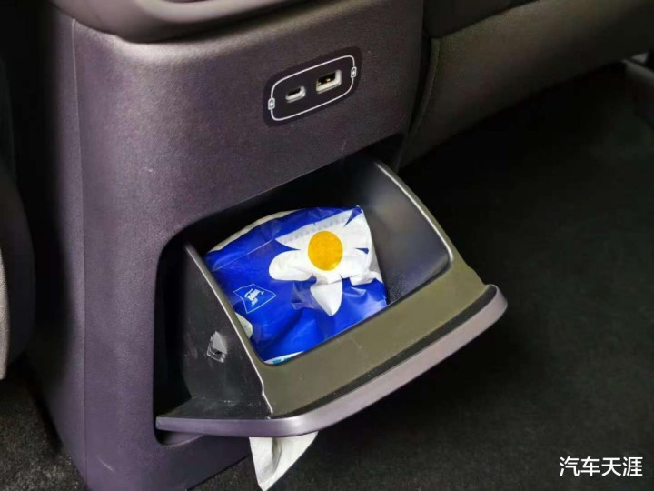 此外还有后排空调出风口下面做了一个开口的储物盒,可以当做纸巾盒,这个细节拿捏很到位,考虑到了实用性,不用在从网上买一个车内纸巾盒。值得一体的是后排扶手杯架做了硬化处理,可以当做一个小茶桌。